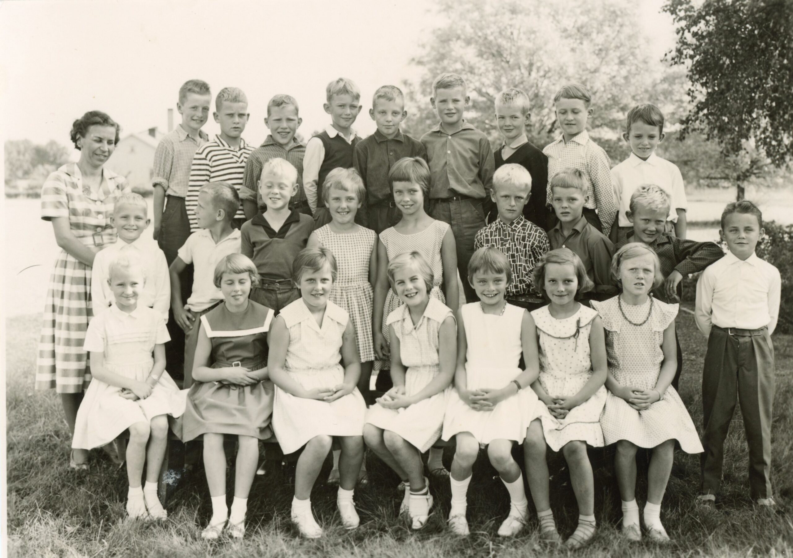 Skolan låg i Harby, cirka 4 km från mitt hem. Jag cyklade ensam till skolan första dagen, en skola som bara hade två klasser – första och andra klass. Klasserna 1 och 2 undervisades samtidigt och min lärarinna hette Sigbritt Fors, gift med en präst, som fick rycka in om “fröken” var sjuk. Ja, man kallade alltid sina kvinnliga lärare för “fröken” och det verkar konstigt att fröken skulle kunna ersättas av sin man. Det var i det här skedet jag träffade “Classe” Björnsson, som kom att bli min gode vän genom åren. En annan lekkamrat var en flicka (!!), Yvonne Karlsson. Till födelsedagar ritade vi barnteckningar till födelsedagsbarnet, och någon ritade Yvonne och mig framför prästen och altaret. Av förståeliga skäl tyckte jag att det var lite “pinsamt”. En luciadag var vi bjudna till fröken Fors, där hon skulle bjuda på tårta. Det blev inget av det, för hennes lille son satte sig på tårtan!